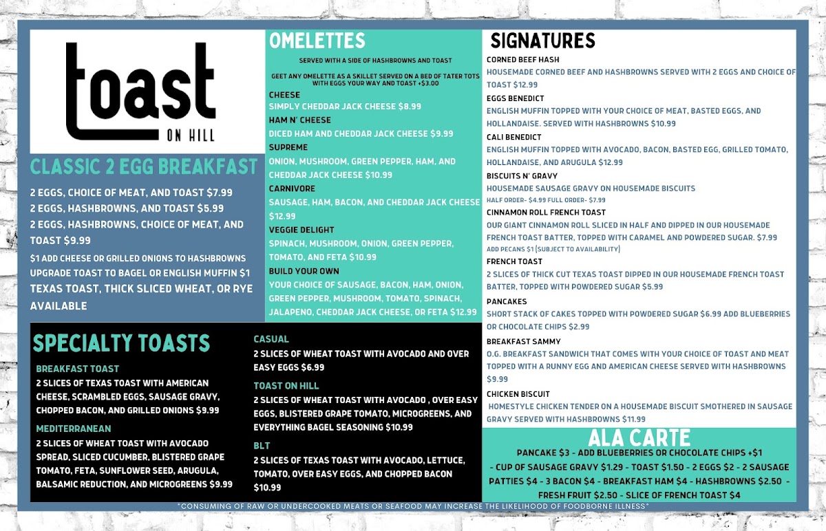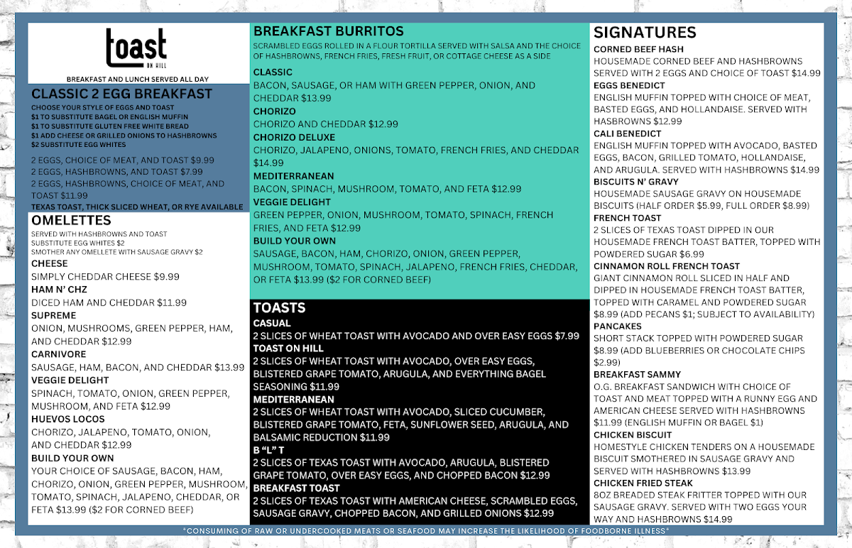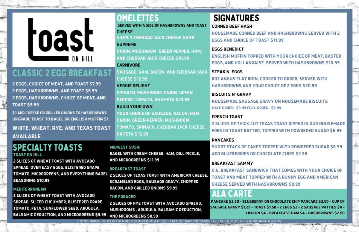 Toast on Hill offers a straightforward yet satisfying diner menu that focuses on classic breakfast and lunch favorites with a comforting, casual vibe. The menu features familiar dishes like biscuits and gravy, hearty burgers, and carefully crafted toasts that blend simple ingredients into approachable meals. Whether you're stopping in for a morning pick-me-up or a relaxed midday bite, the menu fits naturally with the cozy, no-fuss atmosphere of the diner.