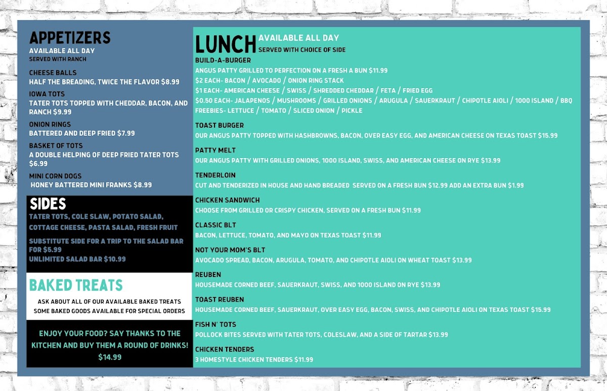 Lunch offerings present easygoing comfort food, from the Toast Burger to the Pork Tenderloin Sandwich, each served on locally sourced buns that add a touch of homegrown flavor. The casual nature of these dishes makes them ideal for anything from a quick solo meal to a friendly catch-up over familiar tastes.